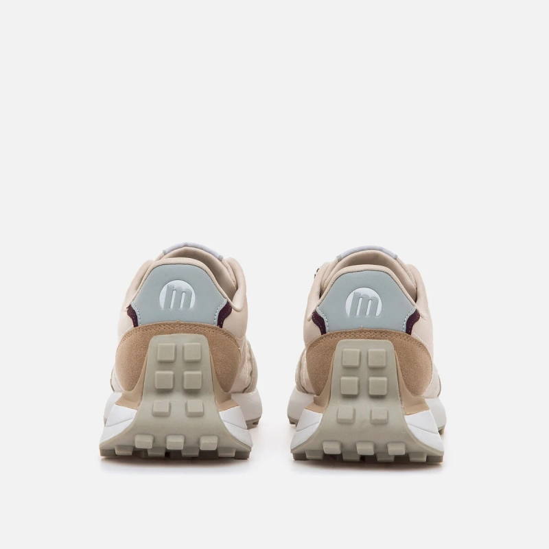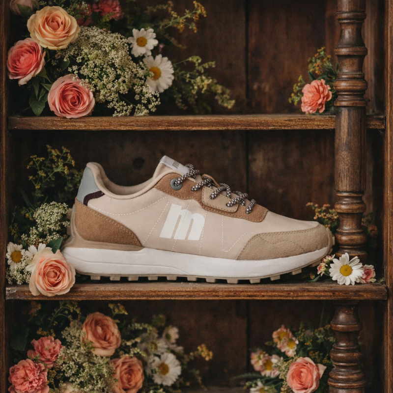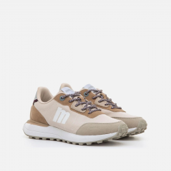 Zapatilla casual de mujer, modelo Zinc de Mustang en tonos beige. Presenta detalles tipo ante de color marrón y gris, logo lateral en blanco y cordones bicolor que aportan un toque dinámico. La suela tipo trail con relieve garantiza una pisada firme, mientras que su diseño ligero con tecnología Extra Light y sus plantillas Starfit, mejoran la comodidad en cada paso. Con certificado VEGANO sellado por INESCOP, el cual garantiza que la naturaleza química principal del material no se corresponde con fibras de origen animal.