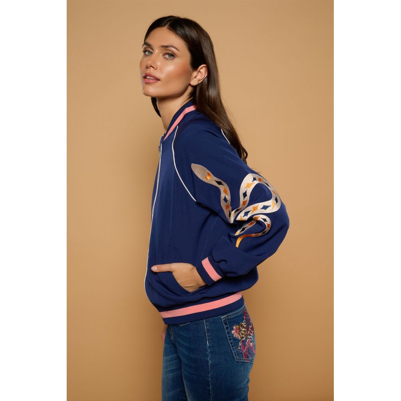 Chaqueta estilo bomber de cuello redondo y manga larga. Bordados en ambas mangas: en una, una serpiente rodeada de motivos astrales (estrellas y diamantes), y en la otra, una composición botánica de serpiente y flores en tonos rosados y ocres. Detalles de vivos en contraste en los hombros y acabados elásticos (canalé) con rayas en tono rosa en cuello, puños y bajo. Cierre con cremallera frontal.