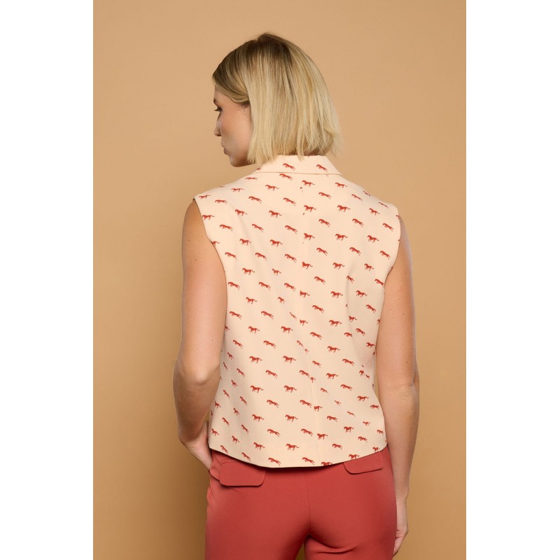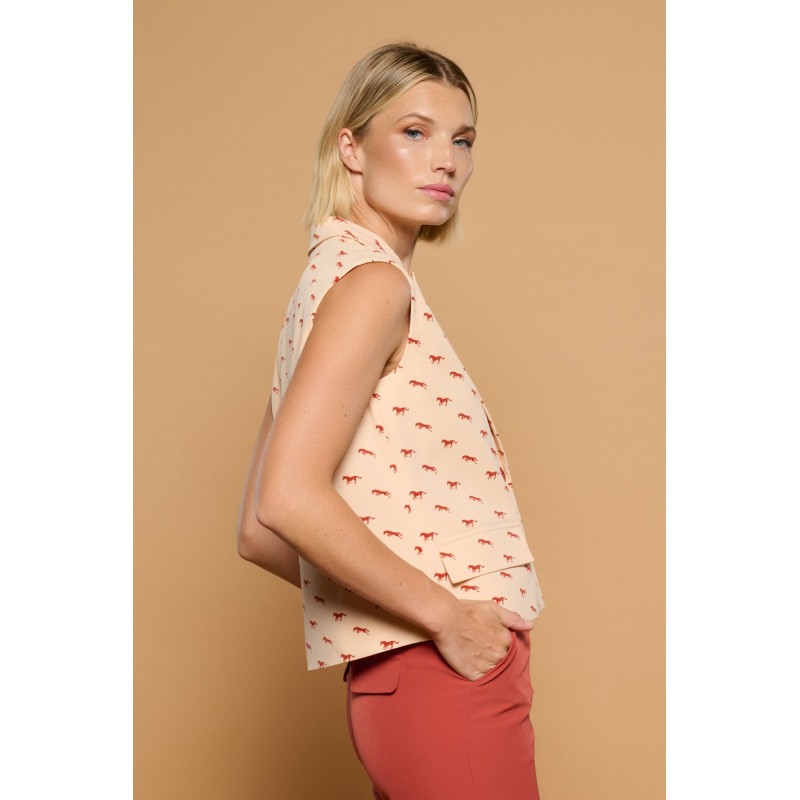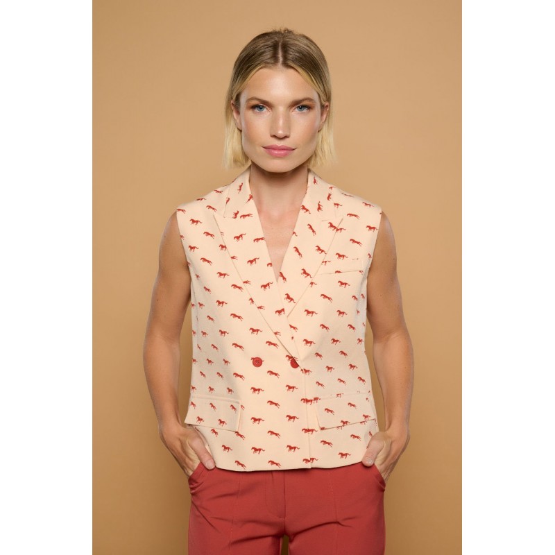 Chaleco estilo blazer de cuello solapa con hombreras. Estampado de caballos teja sobre crema. Solapas efecto bolsillos laterales. Cierre con botones frontales. Forro interior.