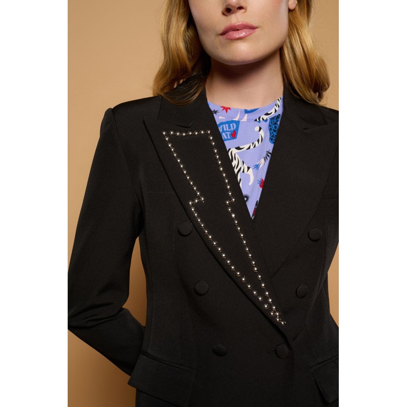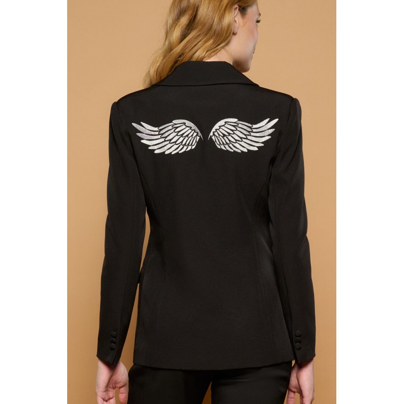 Chaqueta estilo blazer de cuello solapa y manga larga con hombreras. Cierre con botones frontales. Rayo de tachuelas plateadas en solapa. Alas bordadas en hilo plateado en espalda.
