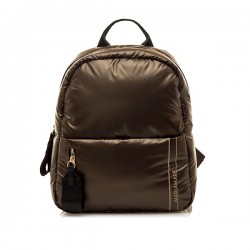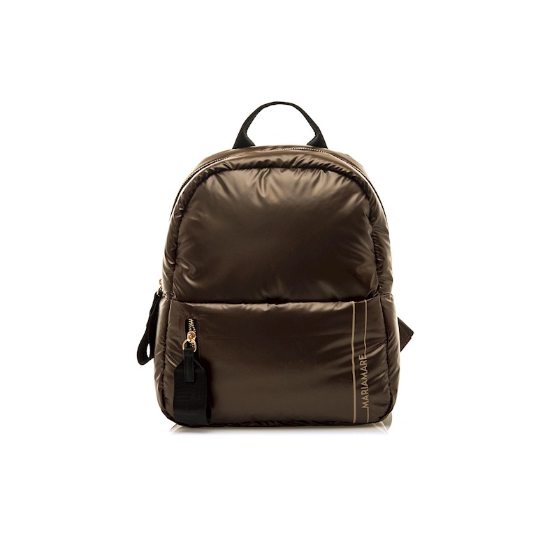 Mochila de color champagne para mujer, modelo Aruna de Mariamare. Su diseño acolchado con efecto brillante la convierte en una opción práctica y moderna para el uso diario. Incorpora un bolsillo frontal con cremallera vertical y tirador ancho, ideal para acceder rápidamente a objetos pequeños. Las asas ajustables permiten un ajuste cómodo. El logo de la marca aparece discretamente en el lateral, reforzando su carácter funcional con un toque actual.