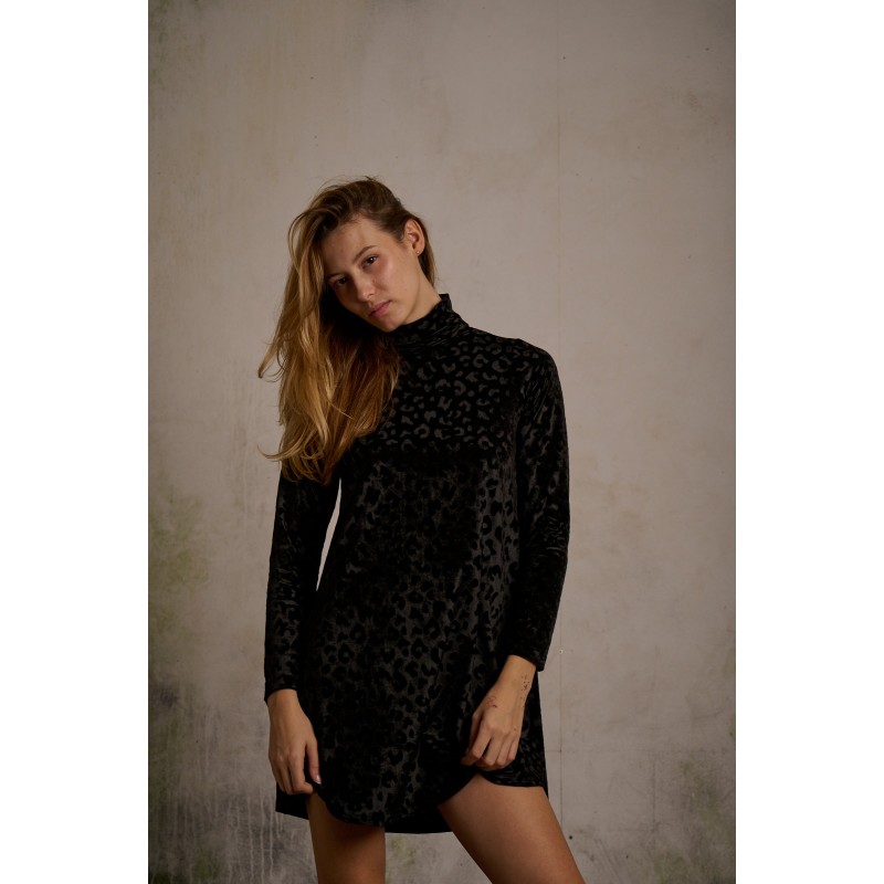 Ficha outfit para las próximas fechas navideñas, el vestido thalía lo tiene todo, la comodidad y la elegancia para las fiestas que están por venir, en tejido de terciopelo haciendo un grabado de leopardo, con cremallera metálica en la espalda y corte evasé.